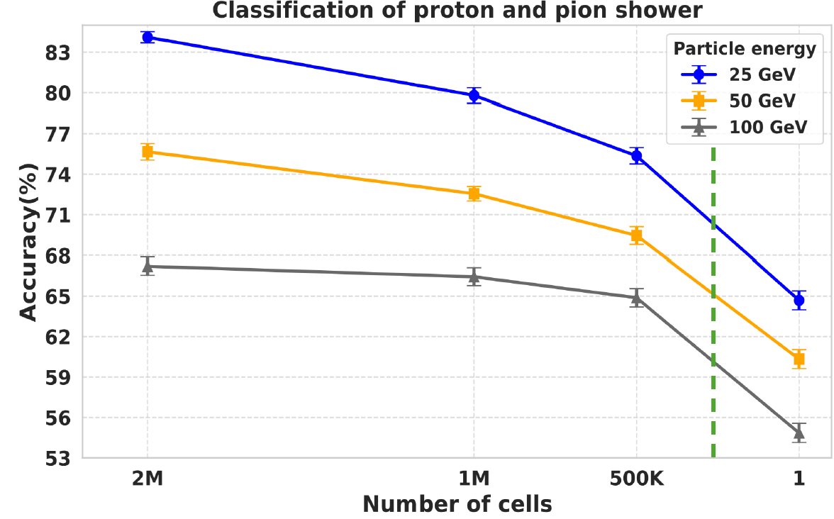 Given that the workshop is titled "Differentiable programming for experiment design", one could question what supervised classification for particle identification has to do with that. But indeed, determining what are the asymptotic capabilities of software tools in extracting particle ID from the topology of the energy deposition of hadrons in a highly granular instrument is a necessary preliminary step to the optimization of these devices: by determining at what granularity scale (the size of individual detector elements capable of independently recording energy deposition and time of interactions) that information is accessible, is a very important input for future calorimeters. You can see below, e.g., how the discrimination power (vertical axis) gets washed out as the volume of cells grows (the horizontal axis), for particles of energy between 25 and 100 GeV hitting a PbWO4 based detector.