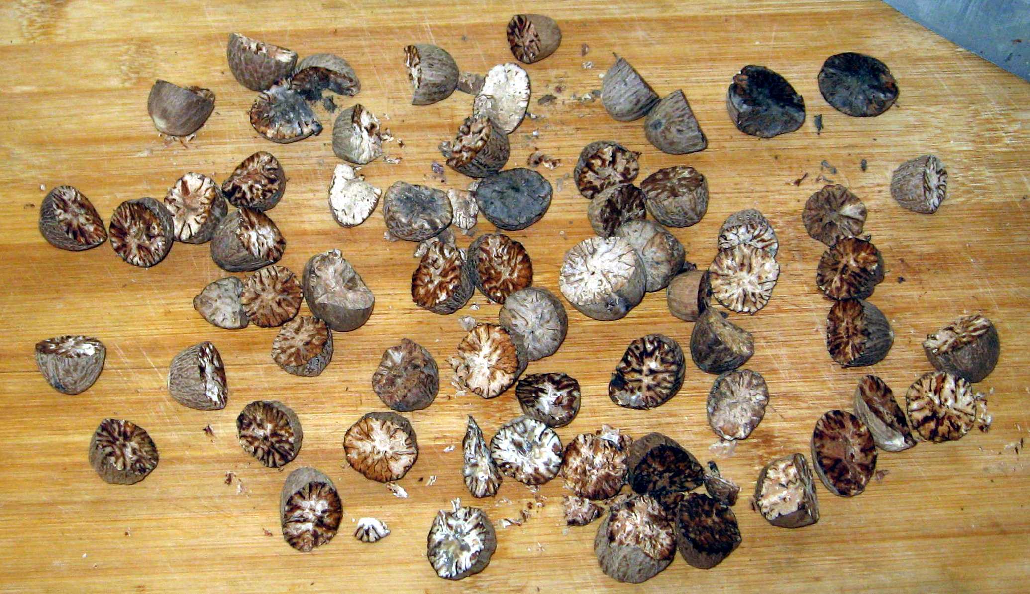 Halved nutmeg nuts: Size, oil content, and so on, differ a lot between nuts. Also notice the very black, gray and extremely white nuts, who seem to have different kinds of fungi attacking them. The nuts look pretty much the same from the outside!