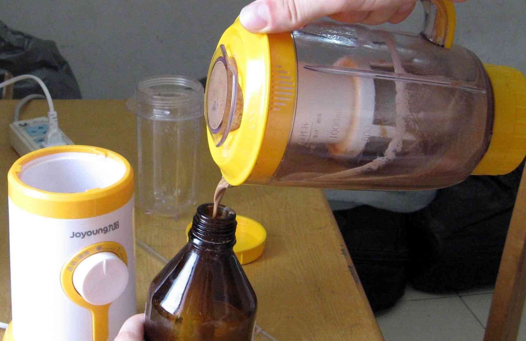 The milk is put into a dark bottle and the rest of the total of 500 ml alcohol, namely 200 ml, is added to the top as before in order to extract a second time. I let the knife rotate at full speed again for a while, then decant the suspension. Then wait and decant a few times more as the mud inside the sieve will still lose a lot of fluid.