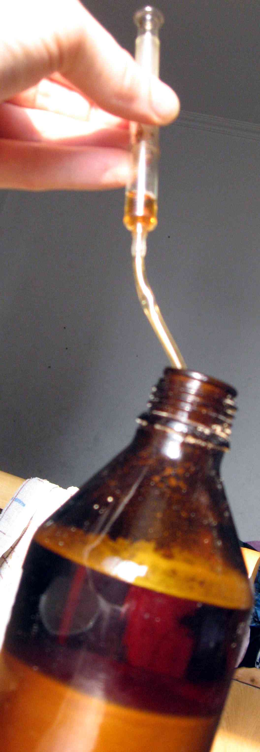 Toss the mud away and let the bottle with the suspension settle. The result of decanting and letting it all sit a few days is the following 200 ml of nutmeg extract above 300 ml of dense milk that has still not settled (photographed against the morning sun):