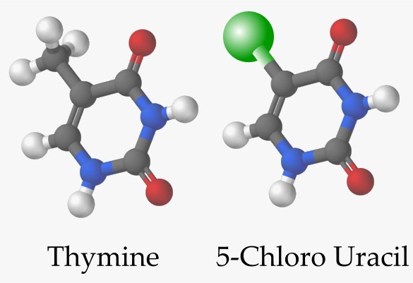 All organisms (on our planet anyway) contain the base Thymine in their DNA. Now in Berlin they have been taking a sample of Escherichia coli (which we all know and love), and subjecting it to increasing concentrations of normally toxic 5-Chlorouracil, whose molecule resembles that of Thymine except that the methyl group has been replaced by a chlorine atom.