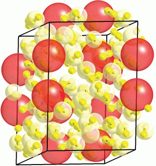| This beastie is a xenon-hydrogen compound, Xe(H2)7, and pairs of xenon atoms are surrounded by spherical units consisting of freely rotating dumbbell-like hydrogen molecules. |