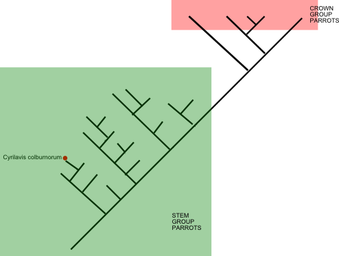 Briefly, though, I think I'll ram home once again that there is no such thing as a missing link. This fossil is a member of the stem group of parrots; a cloud of organisms clustered around the path on the cladogram, a branch of which eventually gives rise to modern parrots, i.e. crown group parrots. I've even gone to the trouble of knocking up a hasty cladogram in InkScape to make it clear.