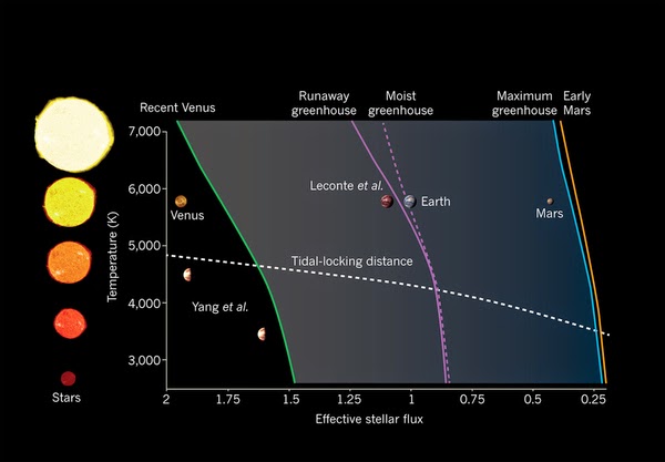 That kind of death spiral is what will happen to our Earth – either if we fill the atmosphere with greenhouse gases, or if we just wait one or two hundred million years, as the inner edge of our sun’s CHZ moves past where our planet orbits.