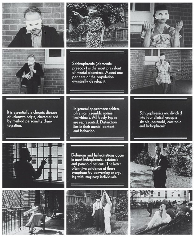 Images from silent film sdepicting institutionalized patients, and text defining schizophrenia and some of the symptoms associated with the disorder. Courtesy of the National Library of Medicine. Images from the History of Medicine (IHM), http://ihm.nlm.nih.gov/images/A109142