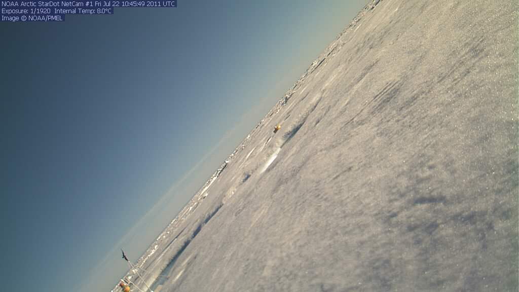 The two cameras drifting near the pole show evidence of ice decay: in one case the camera has toppled to a sharp angle and in the other case, two surveyors poles have disappeared.