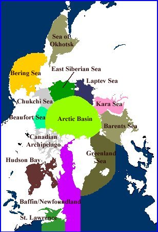 The Cryosphere Today web site divides the Arctic seas into regions which I have labeled in the image below, taken from an original on that site :