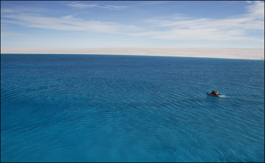 As the surface of the ice sheet melts, rivers of water flow on the surface, eventually collecting in huge blue pools atop the ice or plunging into deep crevasses.