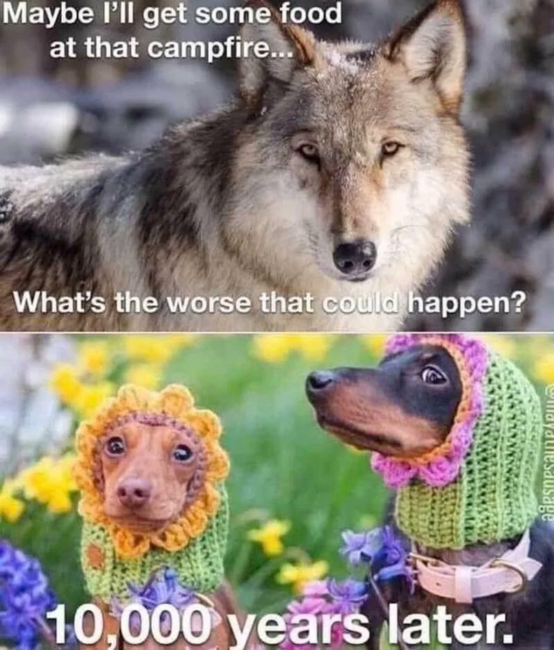 Funny memes aside, though it is known dogs split off from wolves during the last Ice Age, proving association with humans is another matter because they were nearly identical. The thing that changed first was behavior. Wolves that were not friendly were chased away or killed, nicer ones were allowed to co-exist and eventually got fed, etc. Those wolves eventually bred with other moderately tempered wolves and resulting generations became more domesticated.