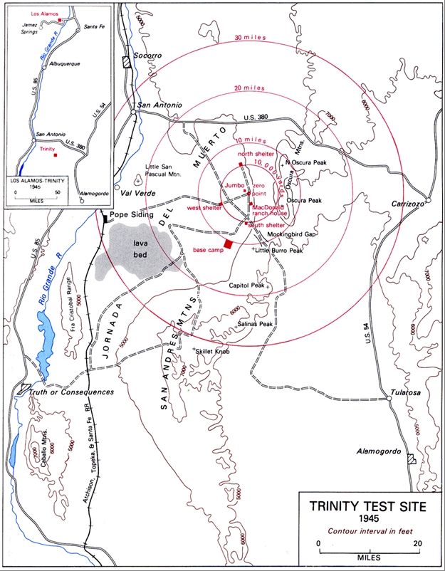 To avoid leaking the secret of the American atomic bomb project, local residents were not warned or evacuated in advance of, or following, the test. Numerous ranches existed in the area, some within 15 miles of “ground zero,” and commercial crops were grown in nearby regions. Several residences closest to the Trinity Site were not known to Army Intelligence officers who had mapped the area. The terrain and air flow patterns in the area caused a number of “hot spots” with particularly high radiation levels. Five monitoring teams traveled along local roads in the hours after the explosion and recorded their findings, but portable instruments were very crude at the time.