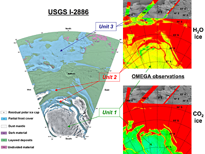 The mapping and spectral analysis by OMEGA has shown that the perennial deposits on the Martian South Pole are of essentially three types: water-ice mixed with carbon dioxide (CO2) ice, tens-of-kilometres-wide patches of water-ice, and deposits covered by a thin layer of CO2 ice.