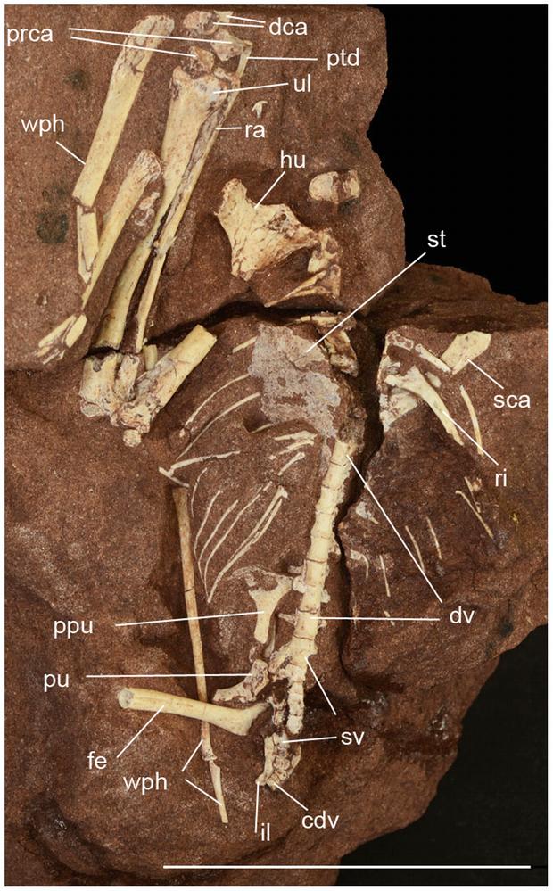 Caiuajara dobruskii gen. et sp. nov., (CP.V 869), partial articulated skeleton. Scale bar equals 50: cdv, caudal vertebrae; dca, distal carpal series; dv, dorsal vertebrae; fe, femur; hu, humerus; il, ilium; prca, proximal carpal series; ptd, pteroid; ppu, prepubis; pu, pubis; ra, radius; ri, ribs; sca, scapula; st, sternum; sv, sacral vertebrae; ul, ulna; wph, wing phalanx. Credit: