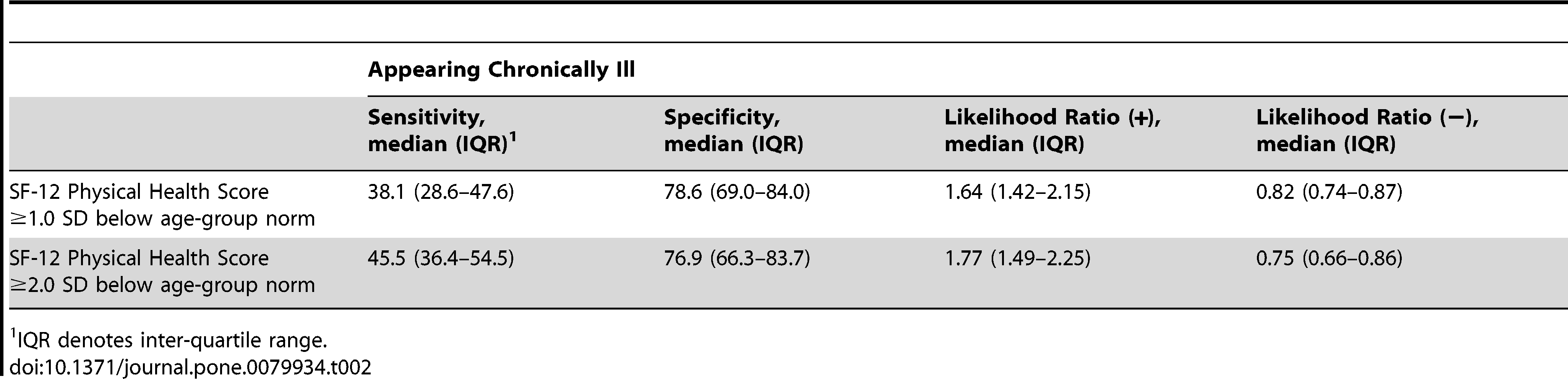 CLICK FOR FULL SIZE. Sensitivity, Specificity, Positive and Negative Likelihood Ratios of “Appearing Chronically Ill” for the Detection of Poor Health Status (n = 111 physicians).