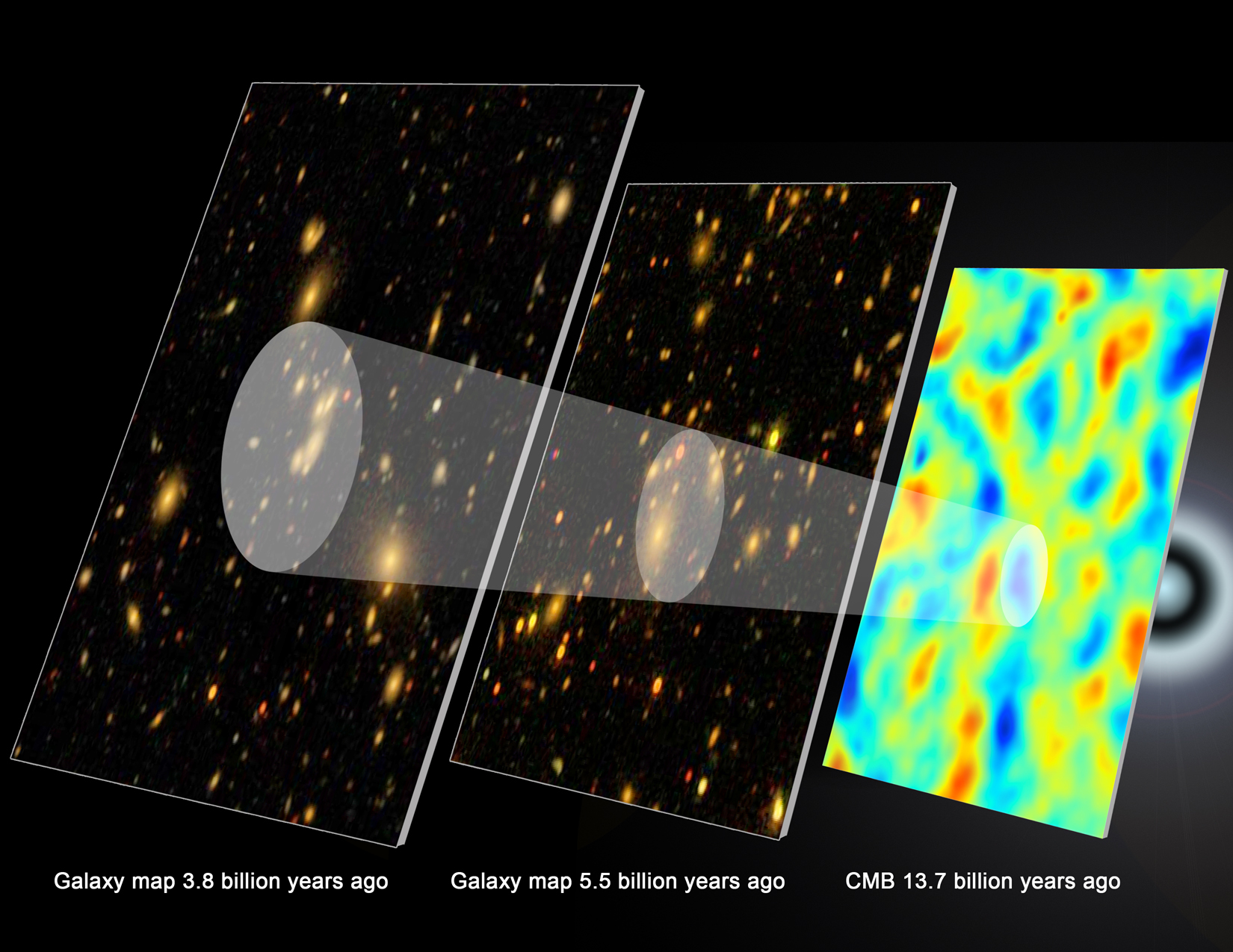 CLICK IMAGE FOR LARGER SIZE. The record of baryon acoustic oscillations (white circles) in galaxy maps helps astronomers retrace the history of the expanding universe. Credit: Eric Huff, the SDSS-III team, and the South Pole Telescope team. Graphic by Zosia Rostomian