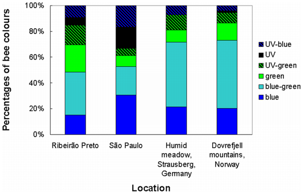 Color compositions of flora from different worldwide locations. The graph shows the relative percentages of plant species with flowers of different bee colors in four different locations: Ribeirão Preto, Brazil; São Paulo, Brazil; Strausberg, Germany and the Dovrefjell mountains, Norway [1], [33]. The differences between the four locations are significant (χ2 test, χ2 = 42.3, p = 0.0002), but notably, plants with flowers of at least five out of six arbitrary bee colors are present at all locations, suggesting that in all habitats, selection is likely to result in the presence of a range of flower colors.