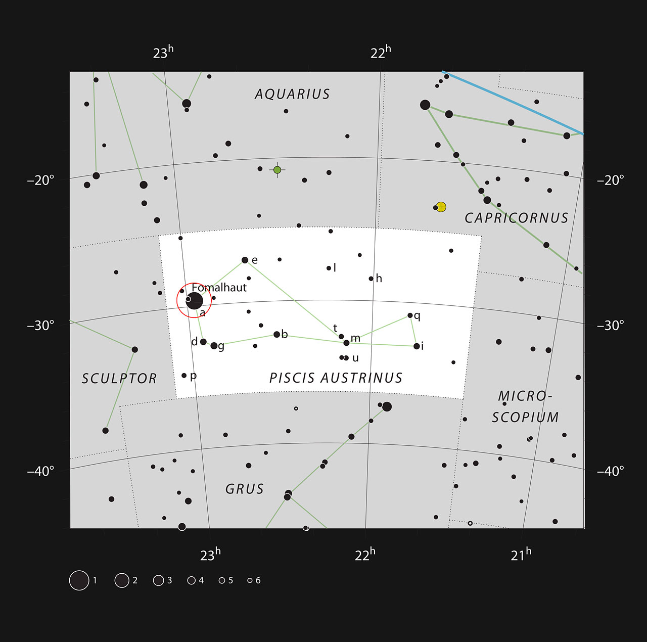 Fomalhaut in the constellation of Piscis Austrinus (The Southern Fish). This map shows most of the stars visible to the unaided eye under good conditions. Fomalhaut is the brightest star in the constellation and one of the brightest stars known to have an orbiting planet. It lies about 25 light-years from the Earth and is surrounded by a huge disc of dust. Credit: ESO, IAU and Sky&Telescope