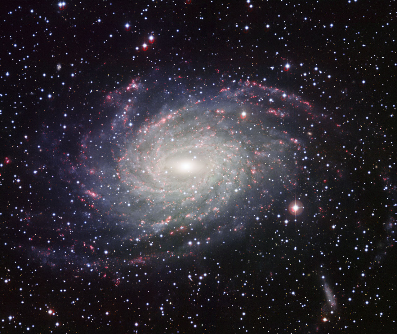 With professional telescopes such as the MPG/ESO 2.2-meter telescope at La Silla, which captured this image, NGC 6744 can be seen in all its glory. The dusty spiral arms are home to many glowing star-forming regions (seen in red) and give this Milky Way look-alike its striking spiral form.
