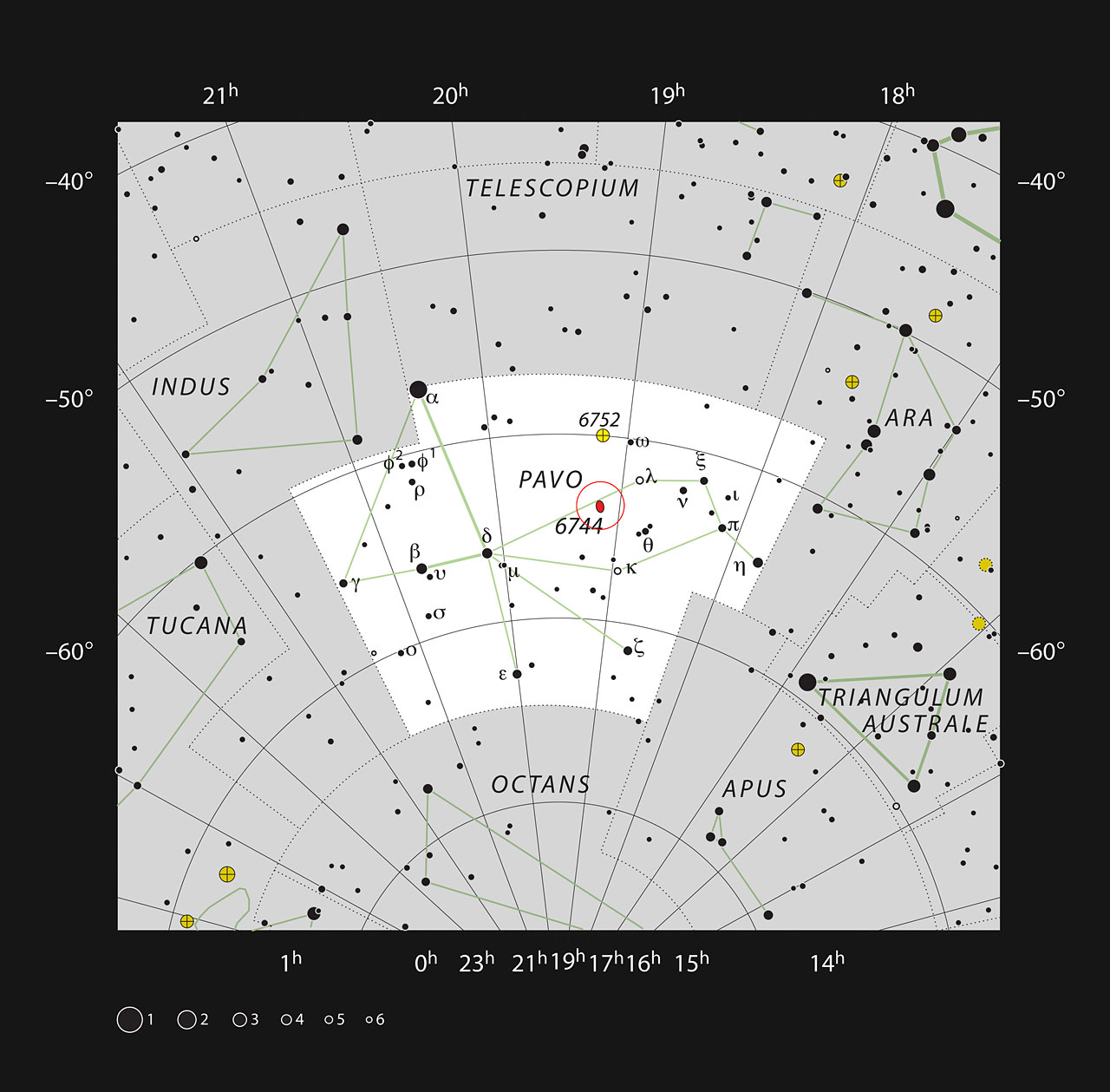Spiral galaxy NGC 6744 in the constellation of Pavo (The Peacock). This map shows most of the stars visible to the unaided eye under good conditions and the galaxy itself is marked with a red ellipse in a red circle. This galaxy can be easily seen with a small telescope. Credit: ESO, IAU and Sky&Telescope