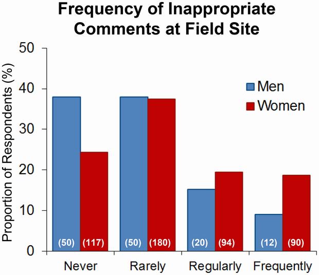 Proportion of survey respondents, by gender, who indicated that inappropriate or sexual comments occurred never, rarely, regularly, or frequently at their most recent or most notable field site (N).doi:10.1371/journal.pone.0102172