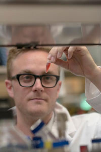 Andrew King, a chemical biology graduate student at McMaster University examines a chemical used in drug discovery research. Credit: McMaster University