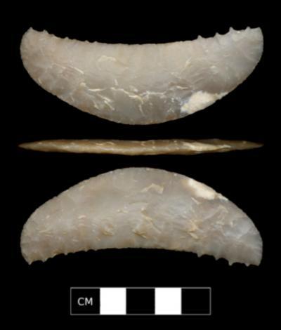 A three-view look at a chert crescent dating to ancient seafarers on San Miguel Island. Photo courtesy of Jon Erlandson
