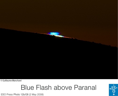 The Earth's atmosphere is a gigantic prism that disperses sunlight. In the most ideal atmospheric conditions, such as those found regularly above Cerro Paranal, this will lead to the appearance of so-called green and blue flashes at sunset. The phenomenon is so popular on the site that it is now the tradition for the Paranal staff to gather daily on the telescope platform to observe the sunset and its possible green flash before starting their long night of observations.