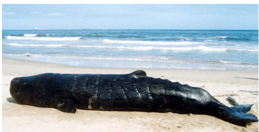 This is a picture of baby sperm whale, Physeter macrocephalus, 4.4 meter long, which was entangled in a trawl net at 20 meter depth near Marina beach, Chennai. It was abandoned by the fisherman, later found stranded near the coast on January 21st, 2002. The dead whale was later buried in the nearby beach by Zoological Survey of India and the skeleton of this whale is kept in the museum.