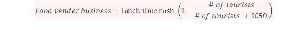 That is if the bus releases the tourists at lunch time when there are the most potential customers rather than when there are fewer customers, it’s easier to see the disruption they create (Let’s call this the “lunch time rush”). The number of tourists required to slow down business at lunch time by half is then used to quantify the interaction of the tourists with the food venders. This is basically the way IC50 values (inhibition constant 50%) for drug studies are produced. For this example, we could call the interference caused by the touriststhe “interference constant 50%” so IC50 still works.