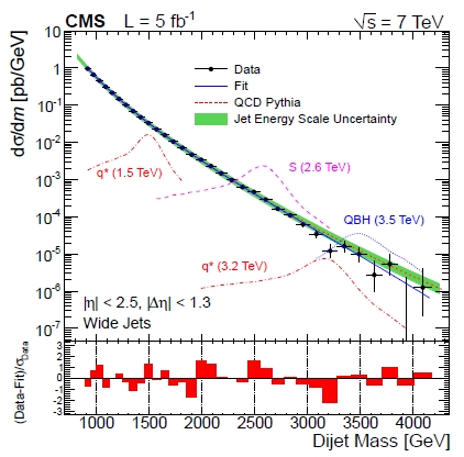 By a simple inspection of the figure, one gathers that ATLAS would have been able to detect a 2-TeV excited quark, while probably a 3-TeV one is at the edge of the experimental sensitivity. But of course reading the numerical results of the search is much more meaningful practice than eyeballing a graph. The results are discussed below, but first let us give a look at the analogous CMS figure.