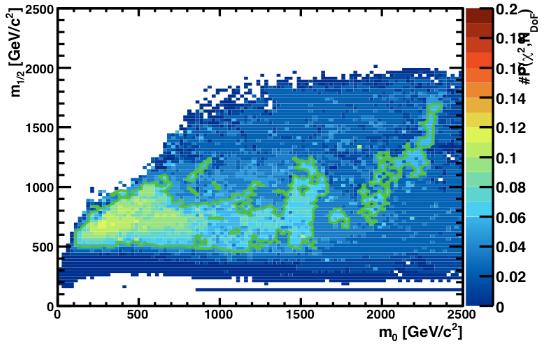 This is the M_0 - M_1/2 parameter space of the CMSSM after the inclusion of 2011 results shown at EPS! The colours provide the fit probability, and the green line encompasses areas with a fit probability better than 5%. The best-fit probability is 11%!! Does this mean that the CMSSM is practically excluded at 90% CL over all the parameter space ? I turn this question to Sven.