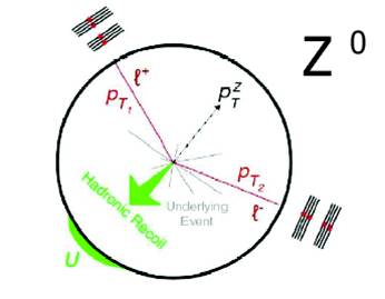 If you produce a Z boson in a proton-proton collision, you do not expect it to be at rest: the unknown imbalance in the longitudinal momentum of the two colliding quarks will get the Z to move one way or the other with significant boost. However, if you look at the production in the plane transverse to the beams, you will see the Z most of the time moving with little momentum: this "transverse boost" is small and is due to the quarks producing the Z boson radiating "soft gluons" before colliding, acquiring a transverse momentum with respect to the beam. This is then imparted to the Z, which when created appears to "recoil" in the transverse plane against soft jets of hadrons - the green stuff in the sketch on the right.The transverse momentum distribution of Z bosons is very well understood and it is the subject of precision measurements at hadron colliders: it in fact allows us to "tune" the parameters of Monte Carlo simulations of the QCD gluon radiation process. The shape of the Z pT is also crucially important to model well the pT distribution of W bosons, which is in turn needed when we try to reconstruct the W boson mass from the momenta of a charged lepton and its neutrino: the detailed understanding of the W pT distribution is a necessary ingredient, and W and Z bosons acquire transverse momentum thanks to the same soft-gluon emission mechanisms: hence the use of the Z decay, whose kinematics can be reconstructed more cleanly from the two charged leptons it emits.