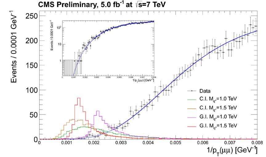 CMS studied the very high-pT Z boson candidates decaying into muon pairs in the 2011 dataset, comparing the pT distribution predicted by the Standard Model with the one foreseen by these new physics models. You can see below the distribution of 1/pT (the inverse of the transverse momentum) for the data and the background prediction: in 1/pT of course the highest momentum events are the ones on the left. The new physics models considered would produce enhancements similar to those shown by the coloured histograms (which refer to "contact interaction" models with mass scales of 1 and 1.5 TeV, respectively, or to new gauge interactions with the same scales). However, no enhancement is seen, which allows CMS to place lower limits on the effective mass of the processes producing the deviations.