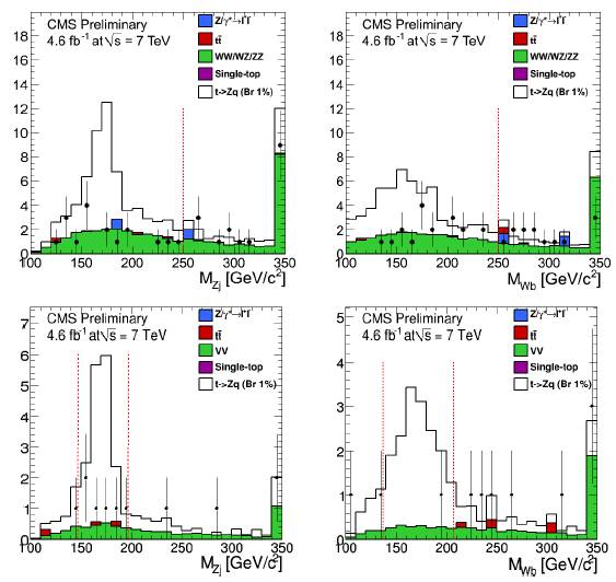 CMS searched for such a signature in its 2011 dataset, finding results in perfect agreement with the absence of a detectable signal. The figure below shows the reconstructed top mass distributions of events featuring three charged leptons (electrons or muons, that is -taus were not considered here), missing transverse energy, and jets. Here one top quark is supposed to have decayed "regularly", to a Wb final state; the W boson then decays to a lepton and neutrino, and the neutrino produces the observed missing energy; the b-quark produces a hadronic jet. The other top is hypothesized to have decayed into a Zc final state, so the event must contain two additional leptons making the Z mass and one additional jet.