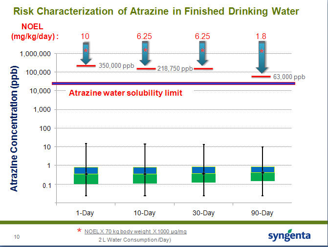 Atrazine levels in water compared to solubility in water compared to the EPA’s No-Effect Levels (NOELs) from animal testing, with water sampling timeframes. Source: Syngenta/Tim Pastoor via the EPA