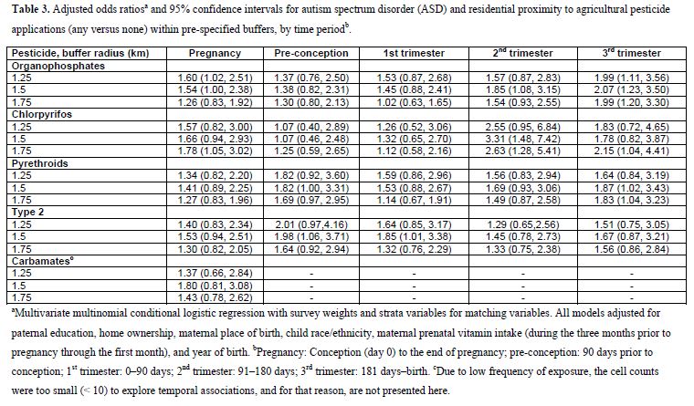 But the authors of the paper in Environmental Health Perspectives don't even know if any of the mothers actually breathed in pesticides or were exposed to them in any way. All they know is that mothers of kids with an autism spectrum diagnosis in the agricultural Sacramento region were more likely to live near a farm that used pesticides. That's common in this region, I live here, and I am within 2 miles of a farm even though I am in a city of 50,000 people. Yet their results counter-intuitively found that living closer to pesticide-using farms was better. The Odds Ratios for people who lived closer (1.25 KM) to farms were weaker than for people who lived farther away (1.5 KM). Weak associations that make no sense often mean it is coincidence that everyone but the authors can see.