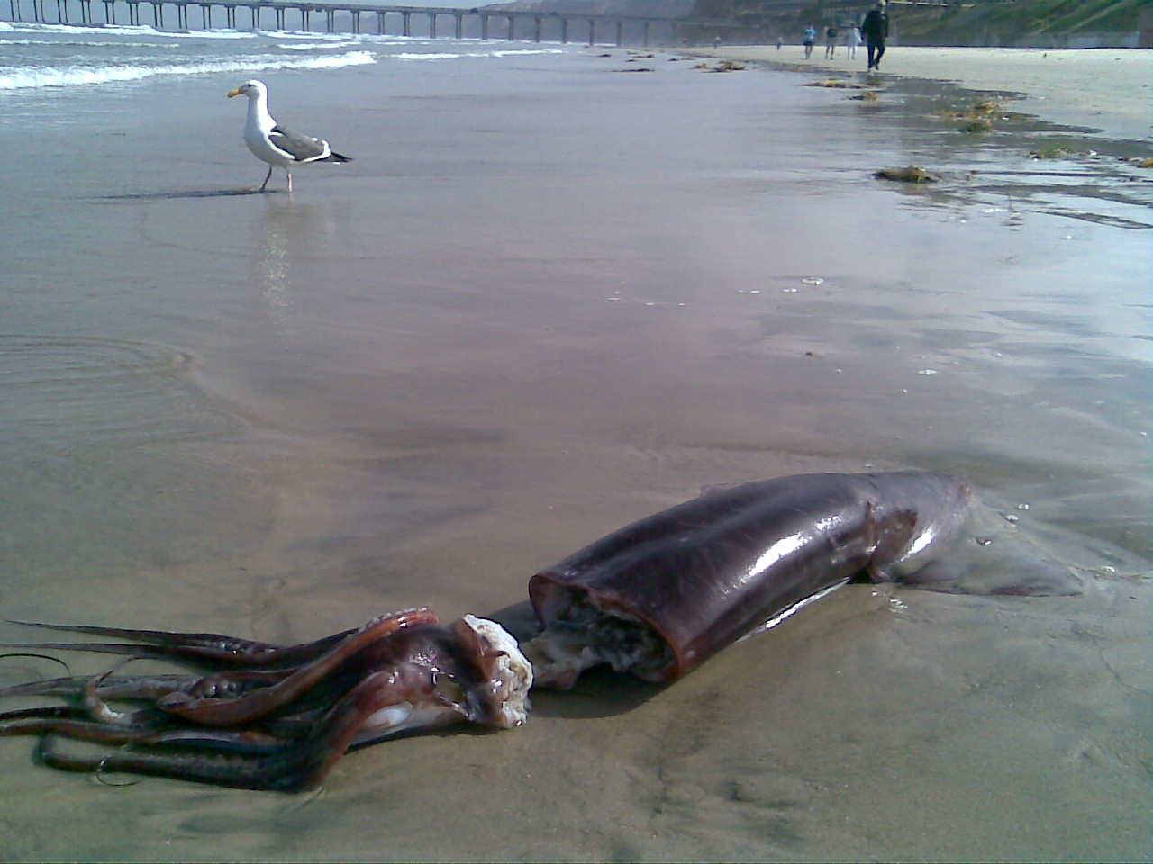 Stranded squid in La Jolla, photo by Mike Navarro. Head probably pecked apart by gulls like that nasty specimen in the background.