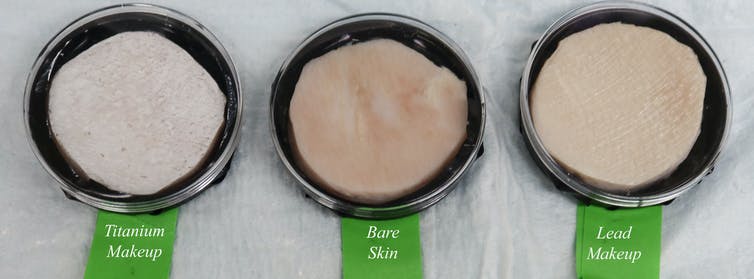 A comparison of bare skin with makeup made with white lead and with titanium dioxide replacing the lead carbonate. Modern recipes that use a titanium replacement look whiter and more opaque than the ‘softer’ yellow-white of lead makeup. (F.E. McNeill), Author provided
