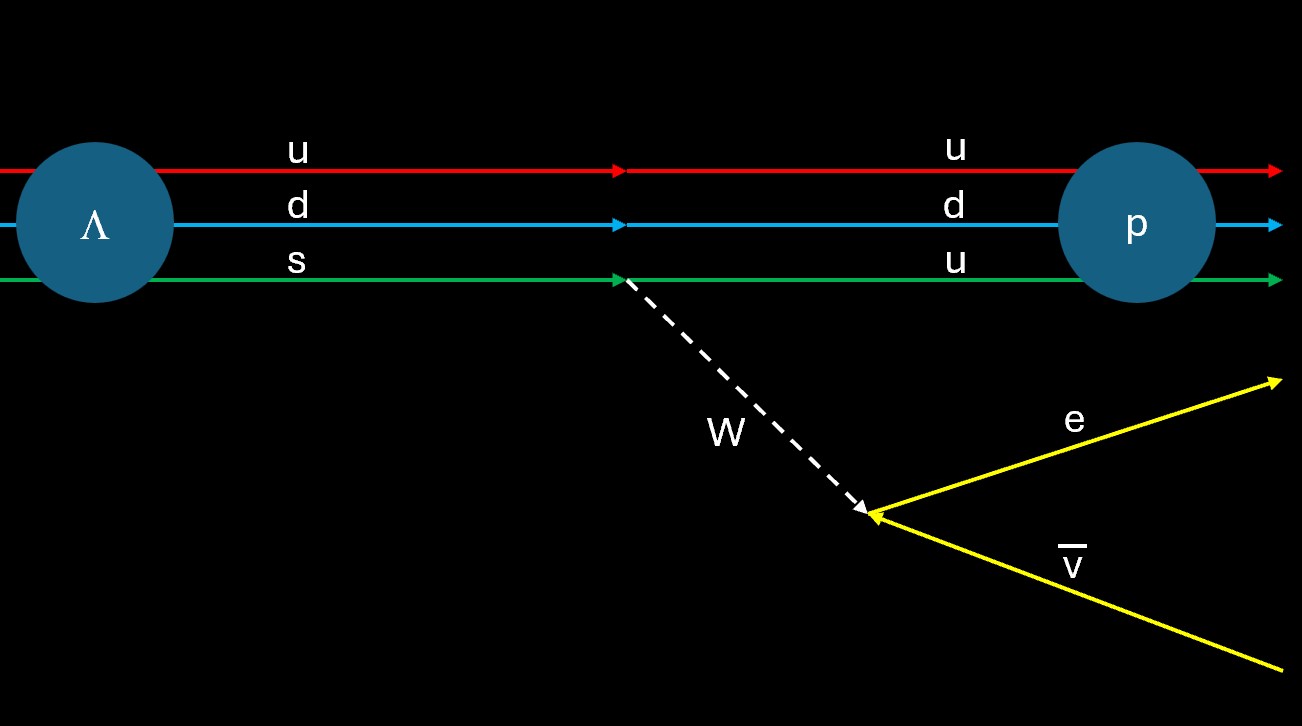 In the graph time flows from left to right, and the vertical dimension symbolizes spatial distances. The Lambda can then be pictured as a stream of three quarks (u,d,s) moving together toward the right. The weak force may turn the strange quark into an up quark through the emission of a W boson (the weak force carrier), shown with a dashed line. The latter may then produce the electron-antineutrino pair in perfect analogy with what happens in neutron decay; but the higher mass of the Lambda makes the phase space larger: the legacy splitting is then blitzing fast, and the three resulting final state bodies (proton, electron, antineutrino) fly away in two tenths of a billionth of a second.