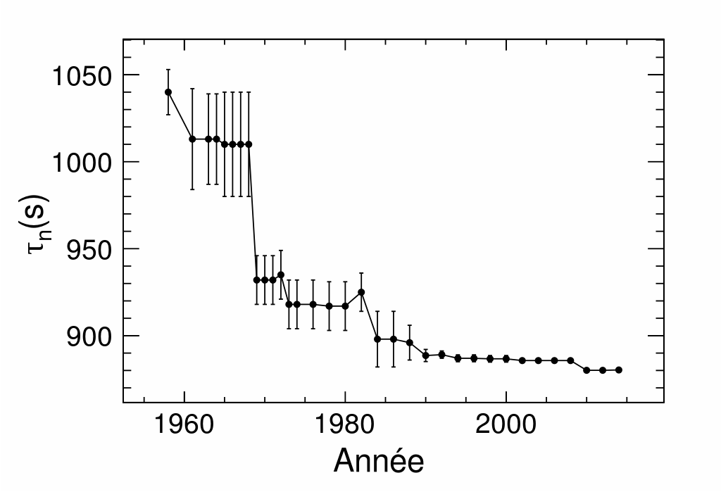 The agreed-upon value of the neutron lifetime, in seconds, is plotted as a function of the year above. As you can see, the value decreased with time quite dramatically, likely due to the combined effec of unknown systematic uncertainties and cognitive biases affecting every new measurement.