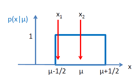 Let me make an example. Suppose your neighbor has a car that leaks oil from any point on its bottom part, and suppose you want to determine where along the road in front of his house the car was parked last night, based on the location of oil spots left on the ground. Your data are two spots left on the ground this time. We can model this problem by saying that there is a uniform "box" probability distribution for the location of the oil spots along an "x" axis which models the road. The width of the box is equal to the length of the car, and here we take it to have length of 1.0, for simplicity (or say we measure positions along x in car length units).