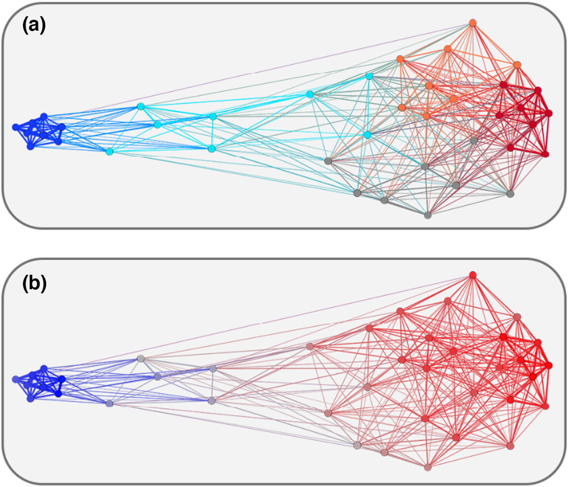 A is the network distribution of forty attitudes into two clusters. Dark Blue is Strong Disagreement. Pale Blue is Moderate Disagreement. Grey is Neutral. Orange is Moderate Agreement. Red is Strong Agreement. B is attitude clusters depicting latent Democrat (blue) and Republican (red) belief-systems.