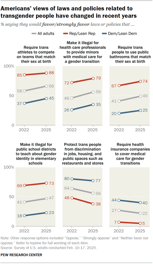The other confounder is the 8 topics, some of them which come across as redundant - more economic support for black people, more socialism and more welfare are all in the same economic sphere. When it comes to trans people, Pew Surveys show the left is actually more nuanced/diverse than the right. They agree among each other less than the right does.
