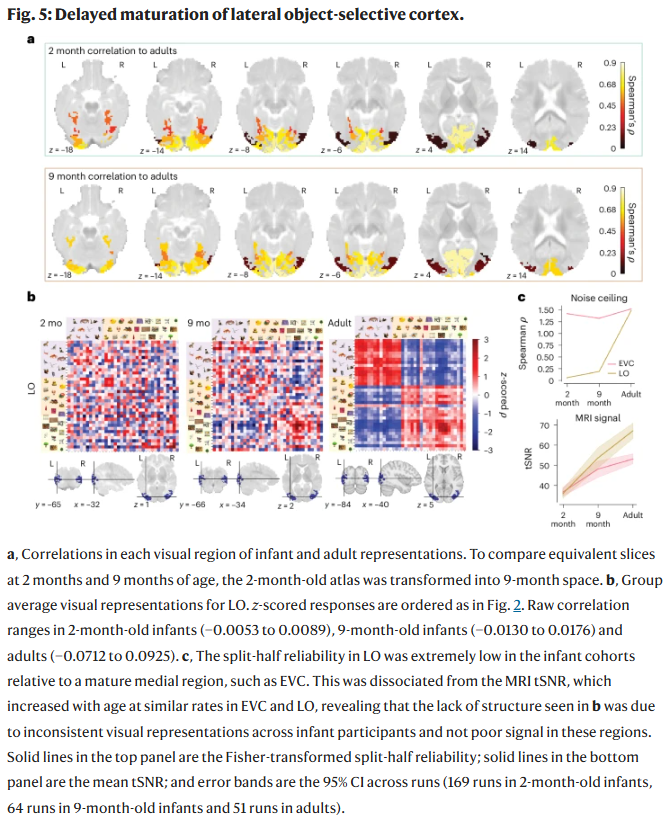 It is fMRI, so don't wonder if it can be a diagnostic tool for neurodevelopmental disorders. Interpretation in fMRI is subjective, and the use of Large Language Models ("AI") to further estimate how the babies’ brains represented different visual categories by comparing activity patterns along the pathways for visual recognition between the models and the brains is a confounder, but it's an interesting idea.