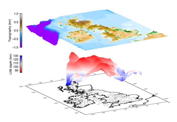 They suggest the hot plume material was preferentially funneled along this corridor, ponding in the thin plate areas due to its buoyancy.Their correlation suggests that hot plume material eroded the lithosphere in this region. This resulting combination of thin lithosphere, hot asthenosphere and decompression melting likely caused the uplift and volcanic activity.