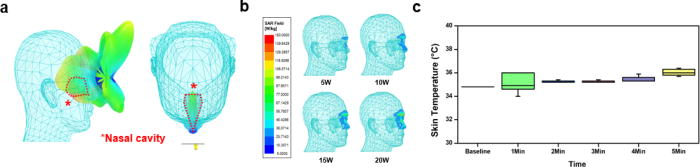 (a) Simulated 3D radiation pattern of the antenna on a 3D head model located between the eyebrows. (b) SAR simulation results at different power levels. (c) Changes in skin temperature over time during RF stimulation. 15 W power was used, with n = 5.
