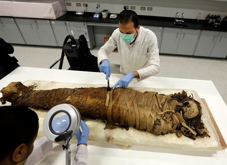 Egyptian conservators clean a female mummy dated to Pharaonic late period, (712-323 BC), in the conservation centre of Egypt’s Grand Museum. Amr Nabil/AP