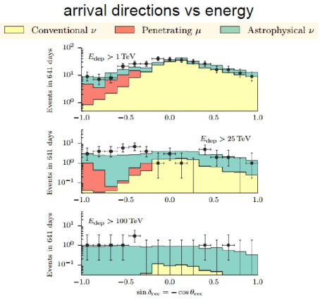 The figure above shows how at very high energy only the signal from cosmic neutrinos is left. For the very high-energy neutrinos, the earth is no longer transparent – it is one absorption length. So events are mostly detected going down.