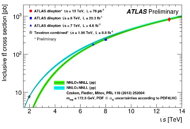 The cross section is shown on the vertical axis in the graph below, as a function of the center-of-mass energy. You can see that as the energy increases, it is increasingly probable to produce those particles. With complex calculations theorists can predict the rate, as shown by the two curves. The red point on the right is the latest measurement by ATLAS: spot on. At least as far as producing top quark pairs, it seems that no exotic processes are playing in at the new investigated energy regime.