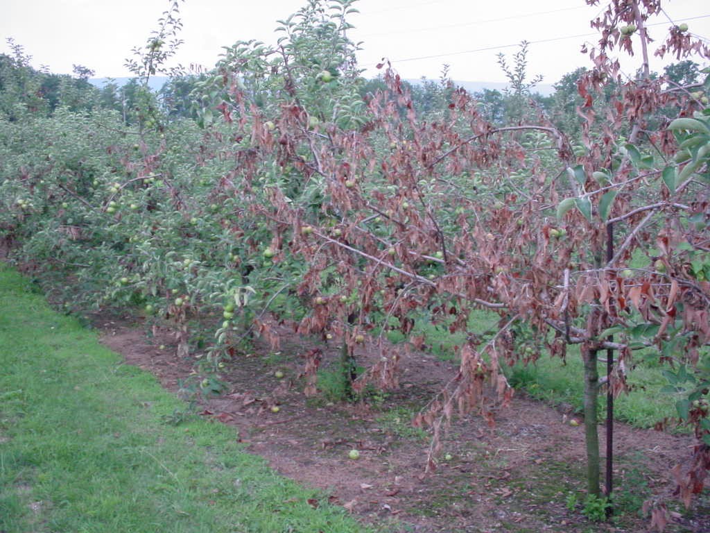 | Apple trees damaged by fire blight, a bacterial disease that enters through flowers (photo PlantDoctor) |