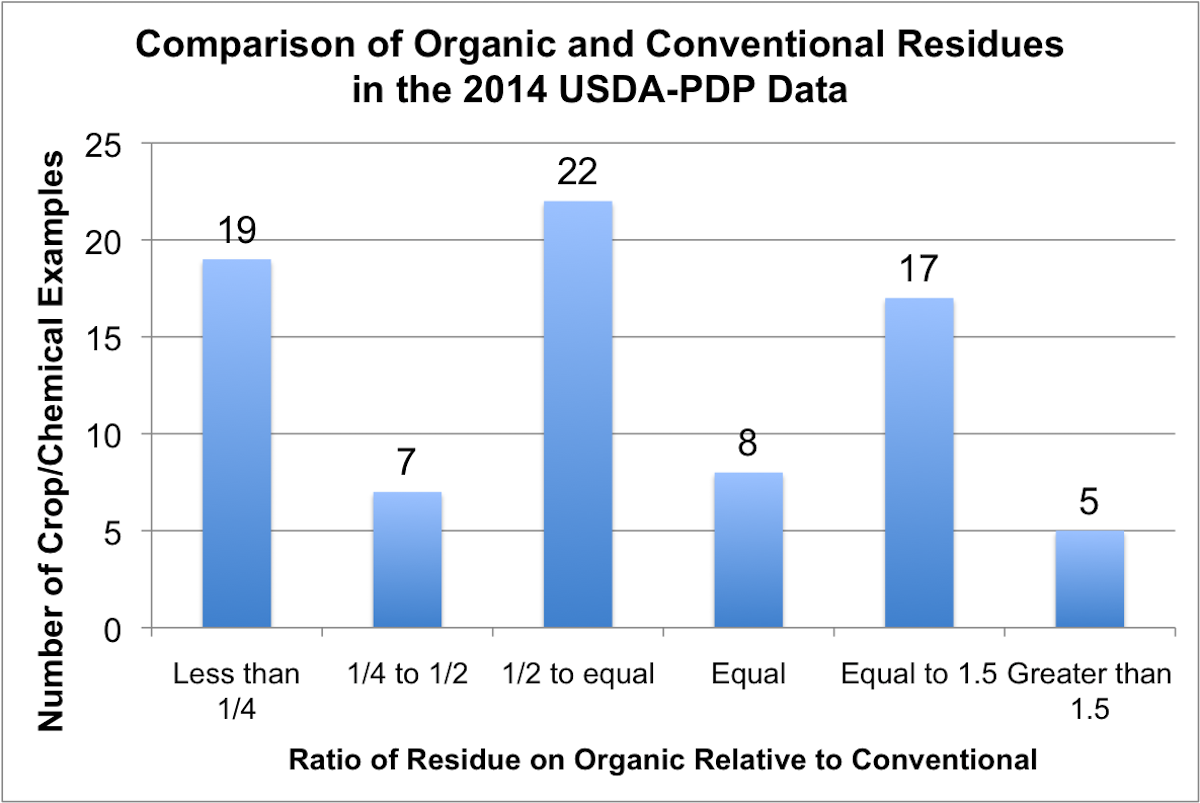 What that transparent source of tax payer-supported research indicates is that 40 different synthetic pesticide residues were detected on organic food samples at levels similar to what was seen for the comparable conventional food samples.